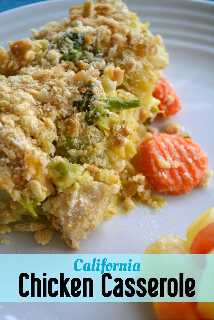 This California Chicken Casserole is my version of the casserole that my mom served. It’s easy, fast, filling and cheap just like hers, but I’ve swapped out a couple of the ingredients with some family favorites. Instead of using tuna I use chicken, instead of peas I use California medley and I replaced the potato chip topping with crushed Ritz crackers. Unlike the casserole that my mom served my family loves this casserole.