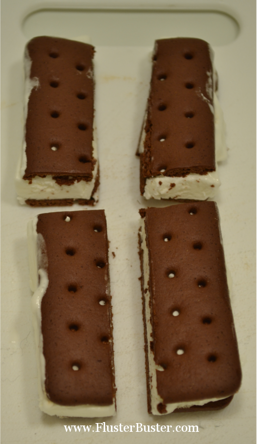 Working quickly, cut the ice cream sandwiches into quarters.
